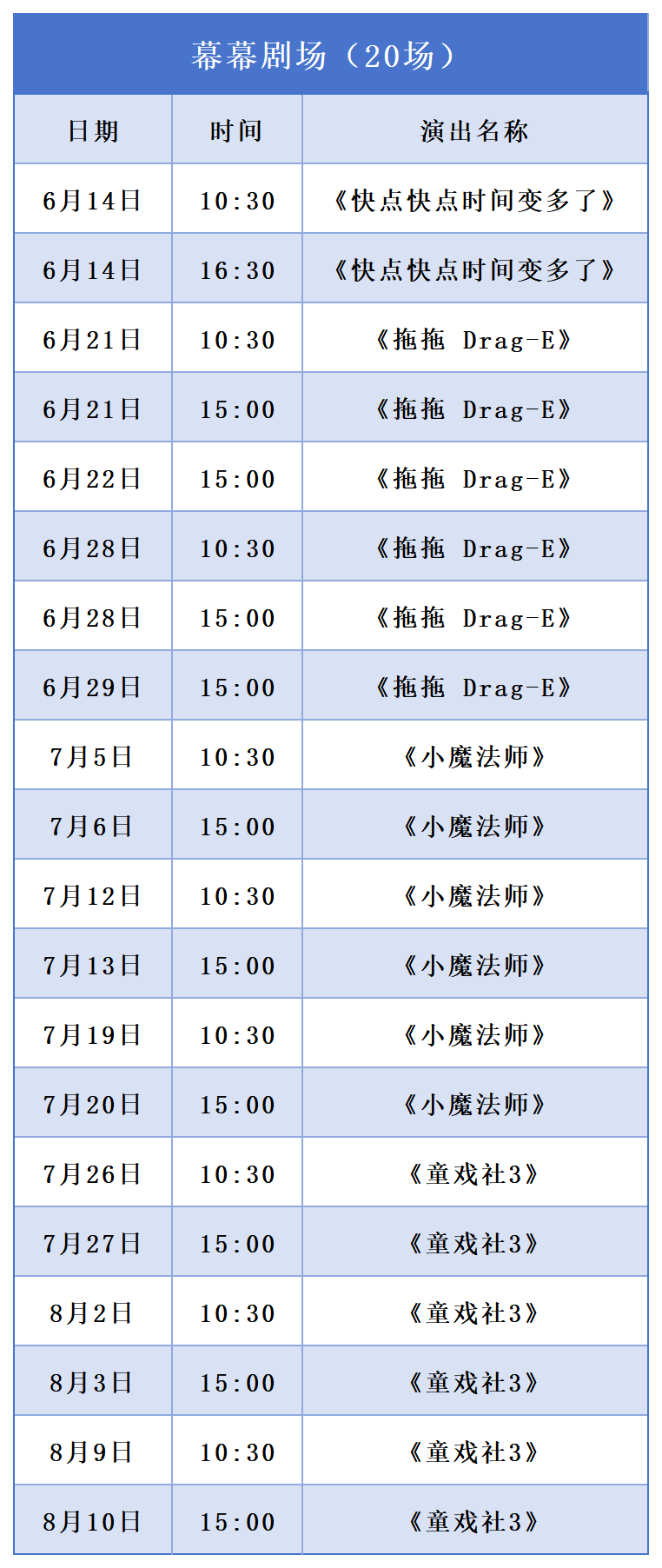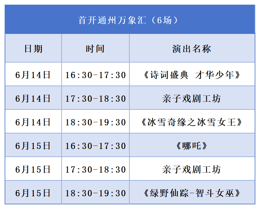 此外,开心麻花通州北投希尔顿沉浸式剧场的开心麻花喜剧生活节、远洋乐堤港幕幕剧场的繁星戏剧村亲子戏剧节、首开通州万象汇溪谷聚场的儿童剧公益演出等“演艺新空间”也将提供丰富选择。