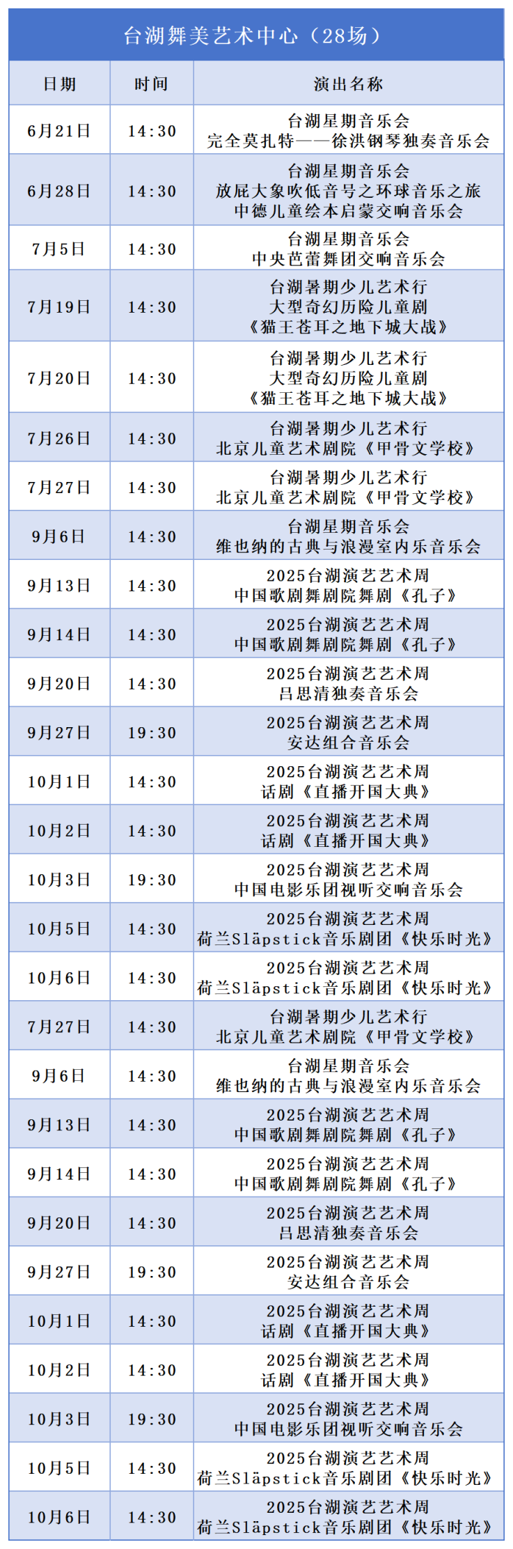 台湖爵士音乐节、开心麻花喜剧生活节、繁星戏剧村亲子戏剧节、夏日周末音浪季、联盟剧目孵化季是本次演出季的核心。